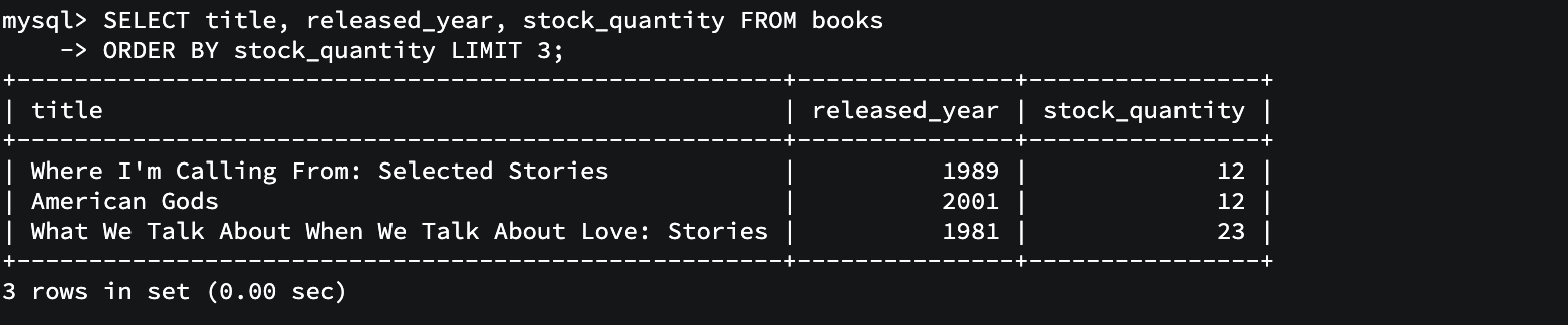 stock_quantity컬럼으로 오름차순 정렬한 뒤 결과를 3개만 출력합니다. SELECT * FROM <테이블> LIMIT 4, 2345346;