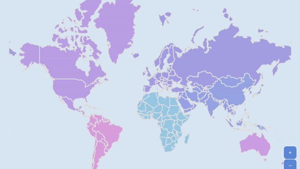 var continents = { "AF": 0, "AN": 1, "AS": 2, "EU": 3, "NA": 4, "OC": 5, "SA": 6 } worldSeries.mapPolygons.template.events.on("click", (e) => { var dataItem = e.target.dataItem; var data = dataItem.dataContext; var zoomAnimation = worldSeries.zoomToDataItem(dataItem); Promise.all([ zoomAnimation.waitForStop(), am5.net.load("https://cdn.amcharts.com/lib/5/geodata/json/"+ data.map + ".json", chart) ]).then((results) => { var geodata = am5.JSONParser.parse(results[1].response); countrySeries.setAll({ geoJSON: geodata, fill: data.polygonSettings.fill }); countrySeries.show() worldSeries.hide(100); backContainer.show(); }); }); var countrySeries = chart.series.push(am5map.MapPolygonSeries.new(root, { visible: false })); countrySeries.mapPolygons.template.setAll({ tooltipText: "{name}", interactive: true, fill: am5.color(0xaaaaaa) }); countrySeries.mapPolygons.template.states.create("hover", { fill: colors.getIndex(9) }); var data = []; for (var id in am5geodata_data_countries2) { if (am5geodata_data_countries2.hasOwnProperty(id)) { var country = am5geodata_data_countries2[id]; if (country.maps.length) { data.push({ id: id, map: country.maps[0], polygonSettings: { fill: colors.getIndex(continents[country.continent_code]), } }); } } } worldSeries.data.setAll(data); // back to continents view button var backContainer = chart.children.push(am5.Container.new(root, { x: am5.p100, centerX: am5.p100, dx: -10, paddingTop: 5, paddingRight: 10, paddingBottom: 5, y: 30, interactiveChildren: false, layout: root.horizontalLayout, cursorOverStyle: "pointer", background: am5.RoundedRectangle.new(root, { fill: am5.color(0xffffff), fillOpacity: 0.2 }), visible: false })); // var backLabel = backContainer.children.push(am5.Label.new(root, { // text: "world map", // centerY: am5.p50 // })); var backButton = backContainer.children.push(am5.Graphics.new(root, { width: 32, height: 32, centerY: am5.p50, fillGradient: am5.LinearGradient.new(root, { stops: [{ color: am5.color(0x654ea3) }, { color: am5.color(0xeaafc8) }], rotation: 0 }), svgPath: "M44 40.8361C39.1069 34.8632 34.7617 31.4739 30.9644 30.6682C27.1671 29.8625 23.5517 29.7408 20.1182 30.303V41L4 23.5453L20.1182 7V17.167C26.4667 17.2172 31.8638 19.4948 36.3095 24C40.7553 28.5052 43.3187 34.1172 44 40.8361Z" })); backContainer.events.on("click", function() { chart.goHome(); worldSeries.show(); countrySeries.hide(); backContainer.hide(); });나라 뷰가 뜨면 우측 상단에 다시 월드 뷰로 돌아갈 수 있는 버튼을 만든다