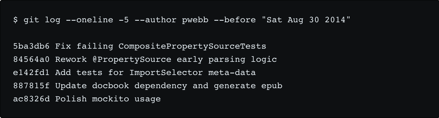 $ git log commit 42e769bdf4894310333942ffc5a15151222a87be Author: Kevin Flynn <kevin@flynnsarcade.com> Date: Fri Jan 01 00:00:00 1982 -0200 Derezz the master control program MCP turned out to be evil and had become intent on world domination. This commit throws Tron's disc into MCP (causing its deresolution) and turns it back into a chess game.$ git log --oneline 42e769 Derezz the master control program$ git shortlog Kevin Flynn (1): Derezz the master control program Alan Bradley (1): Introduce security program "Tron" Ed Dillinger (3): Rename chess program to "MCP" Modify chess program Upgrade chess program Walter Gibbs (1): Introduce protoype chess program이외에도 깃의 다른 기능들 중에 제목과 본문 사이의 공백이 없다면